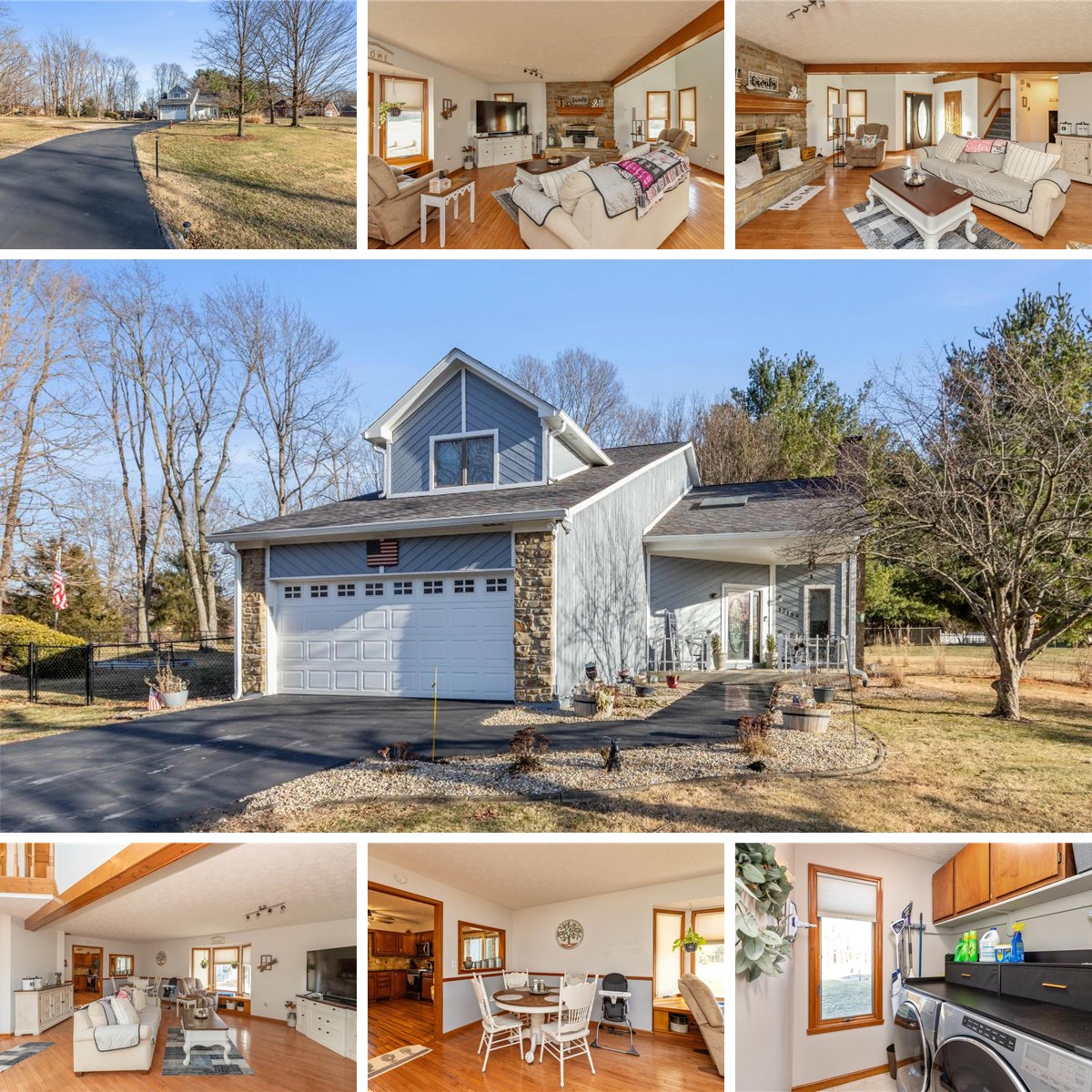 Would you prefer residing in a serene rural subdivision on a spacious 0.83-acre lot adorned with mature trees? This residence boasts 3 bedrooms, 2 stone fireplaces, a spacious Great Room featuring hardwood floors and the stunning fireplace, a two-story foyer with an electric skylight, expansive Master bedroom complete with hardwood floors, fireplace, sitting area, walk-in closet with custom organizer, master bath with double sinks, jacuzzi tub, and separate shower. The bedrooms are generously sized with ample closet space. The kitchen has been updated with granite countertops and stainless steel appliances. The heated and cooled Sunroom offers versatility. The Formal Dining room, also featuring hardwood floors, accommodates large family gatherings. Convenience is highlighted by the Mud/Laundry room accessible from the garage. Key features and updates include: beautiful casement windows fitted with new custom blinds, Central Vacuum system, wood floors throughout, large Mini-Barn, partially fenced backyard with patio, finished garage equipped with heat and cooling, service door, and keyless entry, new roof, gutters with leaf guard, new HVAC system with whole-house humidifier, new 200 Amp breaker box, and Kinetico System. The property offers a picturesque setting.