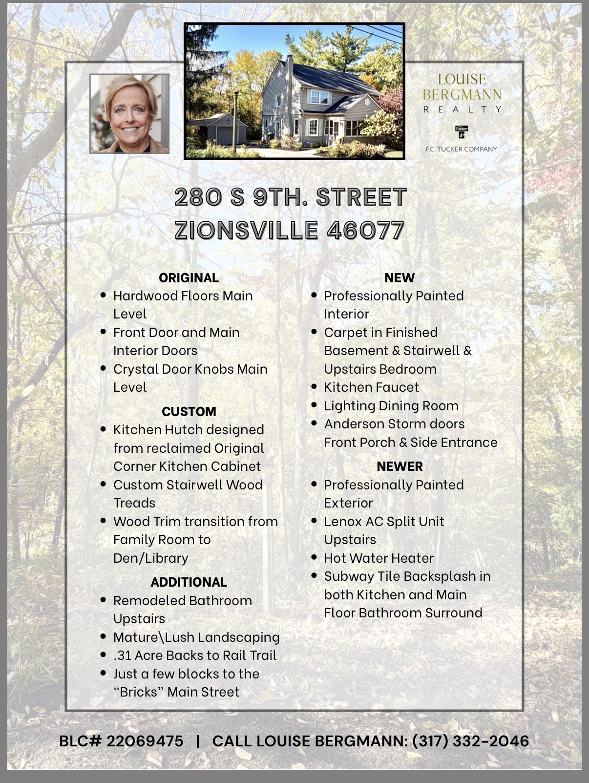 A Timeless Village Treasure Backing to the Rail Trail. Tucked away on a quiet street in the heart of the Village of Zionsville, this 1945 gem offers the perfect blend of small-town charm and everyday convenience. With .31 acres of tree-lined privacy and the Zionsville Rail Trail just beyond your backyard, this home invites you to slow down, breathe deep, and enjoy life at a more peaceful pace on your screened in porch. Inside, history and heart meet at every turn. The main level features original hardwood floors that tell stories of generations past, while solid wood doors and vintage crystal hardware showcase craftsmanship you can feel. As well, the main-level bath, includes the original tub and classic tile flooring, feels like stepping back in time - in the best possible way. Offering over 2,200 square feet of finished living space (and more than 2,500 total), there's room to spread out, gather with loved ones, or find a quiet nook for yourself. Each space feels grounded in character yet ready for your personal touch. Notice the brand new professional paint throughout the home along with new carpet in the Rec/Playroom in the Basement, remodeled upstairs bath and new Kitchen Faucet and Lighting in the Dining Room. Step outside and hit the Rail Trail or go a few blocks to the "Bricks" Main Street in the Village - grab coffee at your favorite cafe, stroll through boutiques, or enjoy dinner downtown - all just minutes from your front door. This is more than a house. It's a piece of Zionsville's story, waiting for you to write the next chapter of your own!
